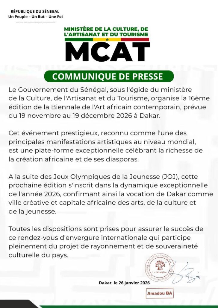 Le Gouvernement du Sénégal, sous l’égide du ministère de la Culture, de l’Artisanat et du Tourisme, organise la 16ème édition de la Biennale de l’Art africain contemporain, prévue du 19 novembre au 19 décembre 2026 à Dakar.